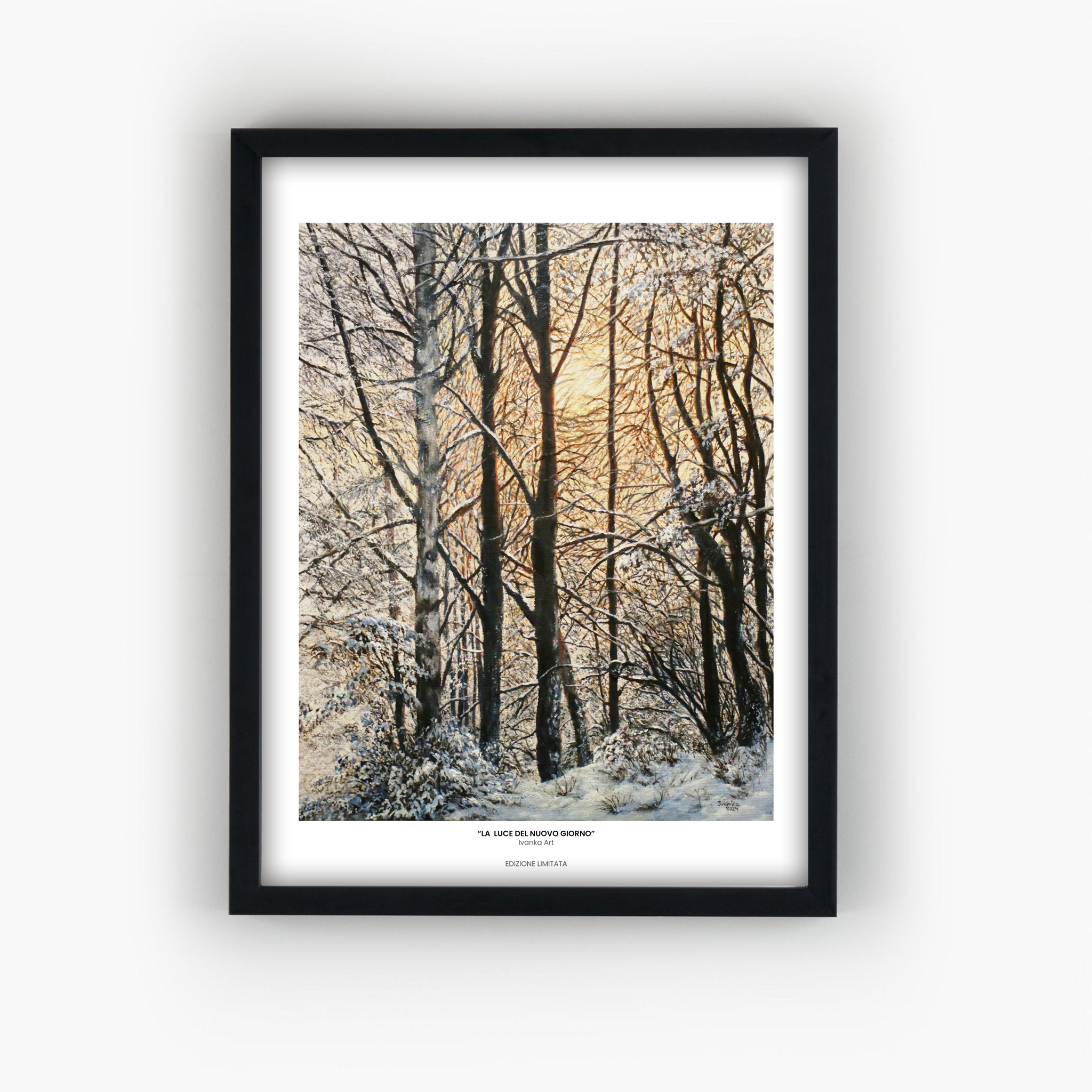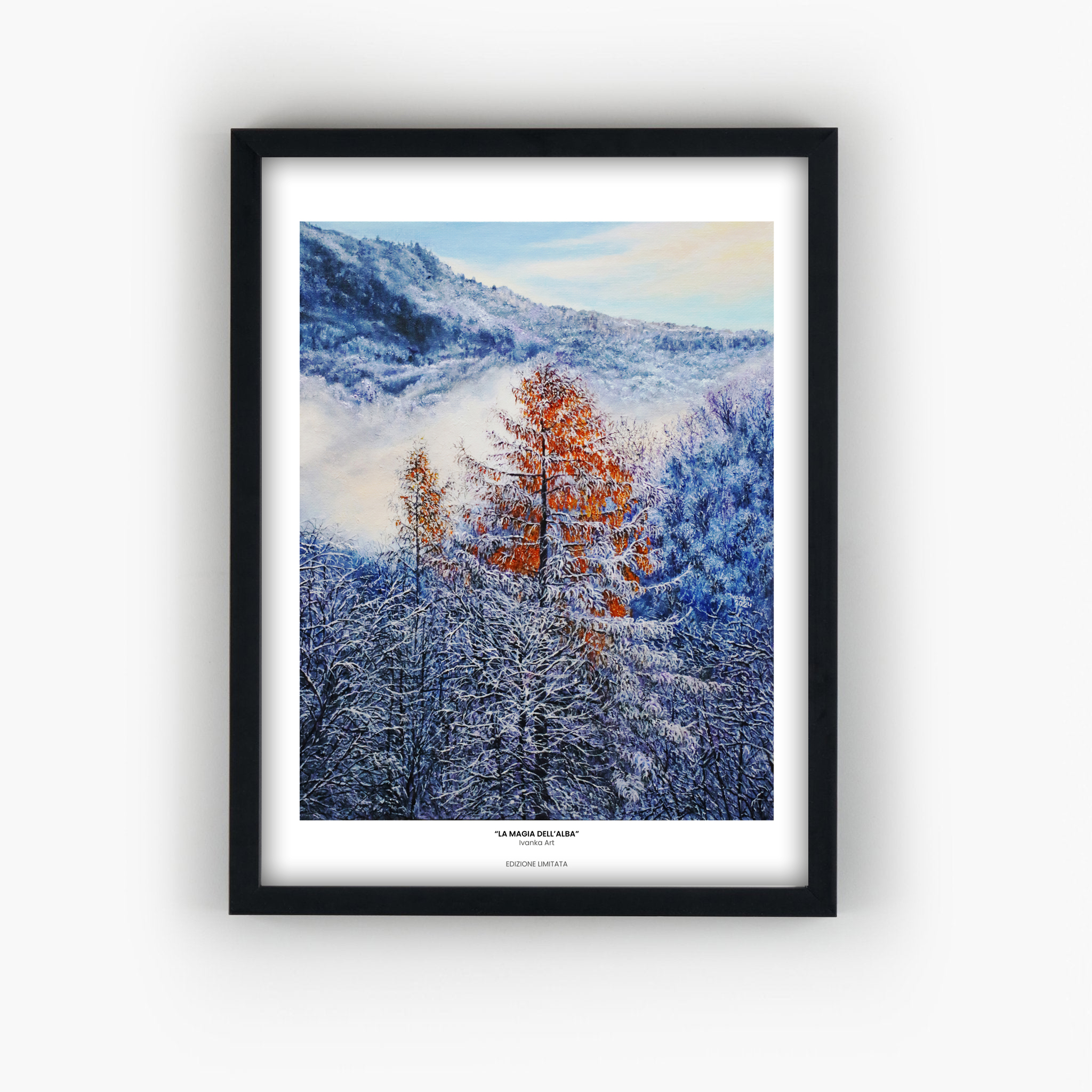 La pennellata morbida e avvolgente restituisce la sensazione di freschezza, di aria pulita e di pace profonda che solo certi angoli di montagna sanno regalare. Questa stampa è pensata per chi ama la natura come rifugio, per chi cerca immagini capaci di rallentare lo sguardo e riportare equilibrio negli spazi quotidiani.