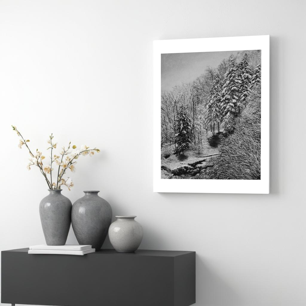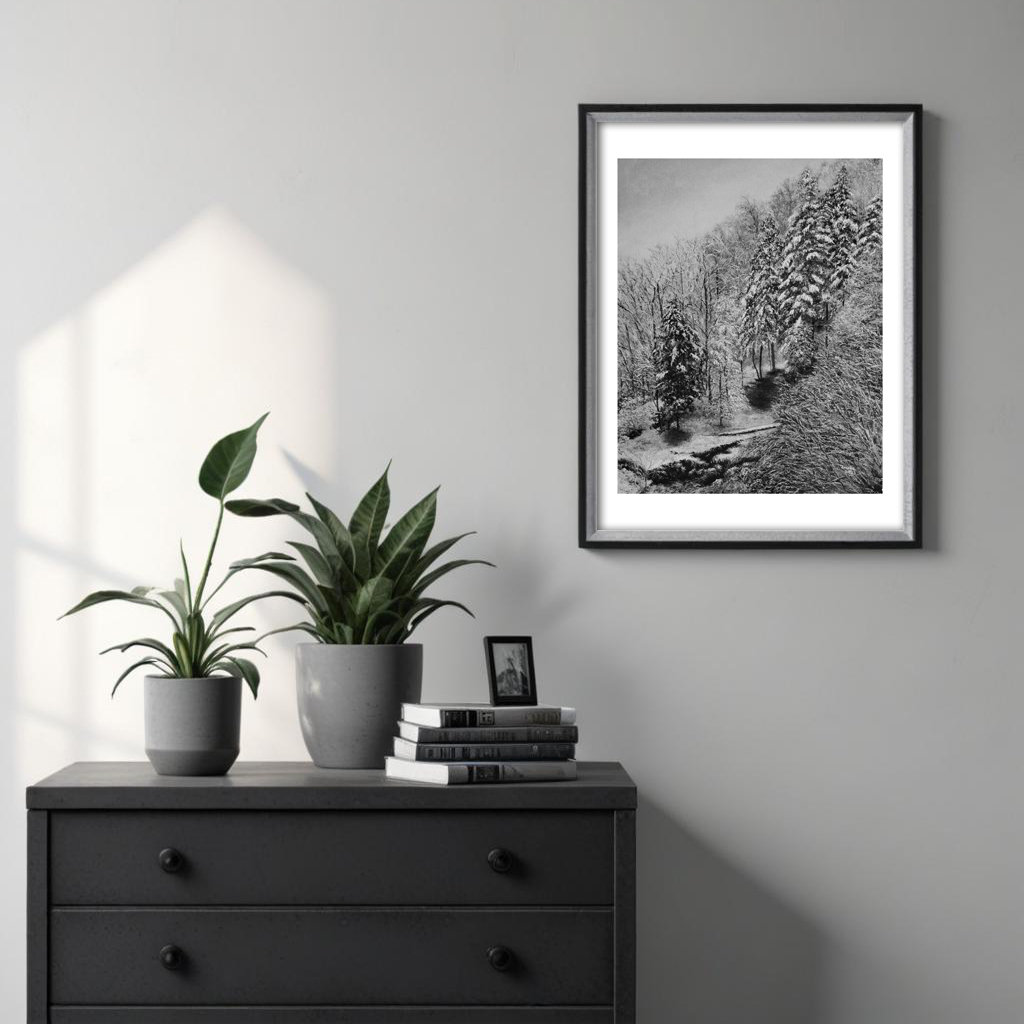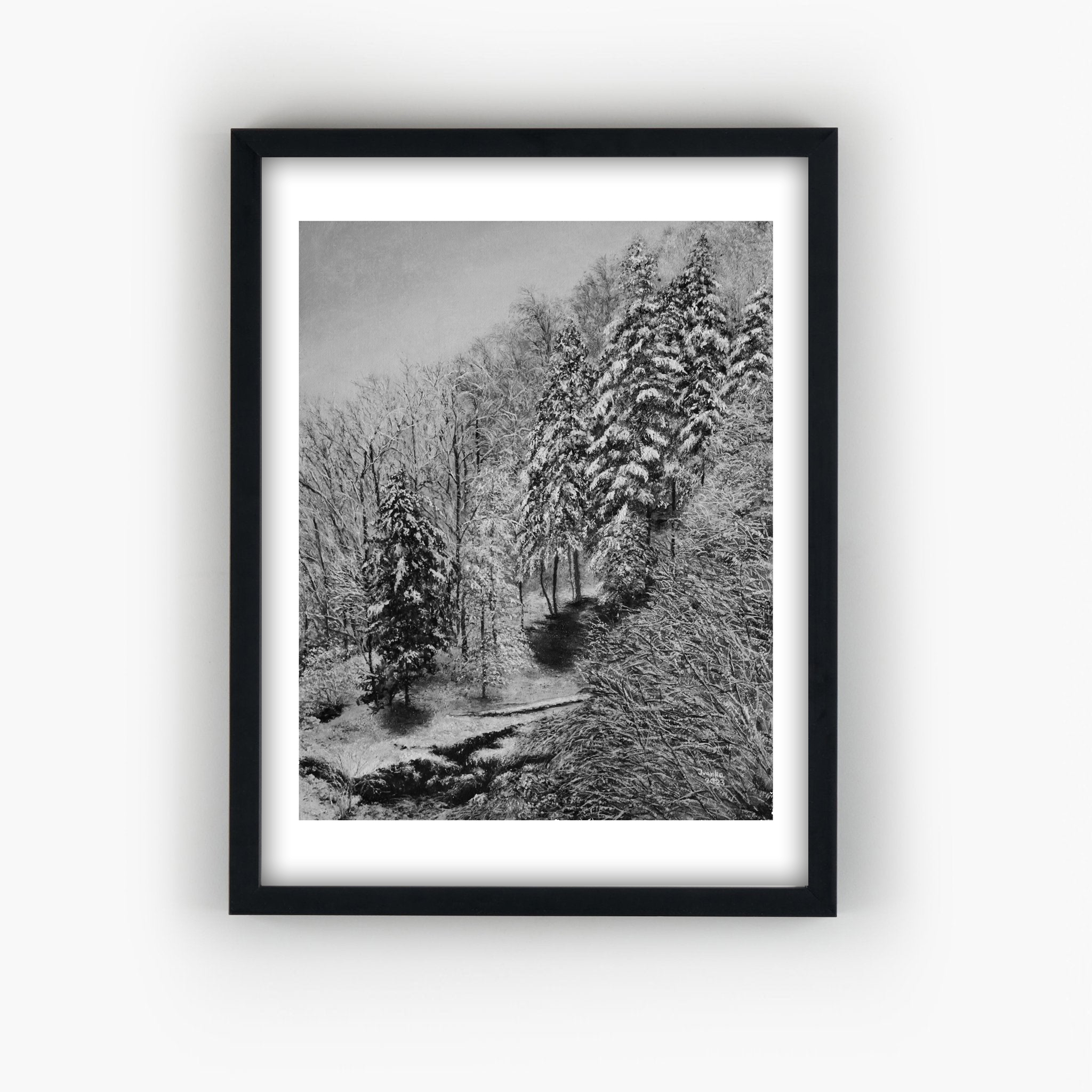 Quando la Natura si veste di bianco, il paesaggio si trasforma e il silenzio assume una dimensione quasi sacra. In quest’opera, un gruppo di pini innevati si adagia sulla pendenza del paesaggio montano, come presenze vigili e silenziose immerse nella quiete invernale.