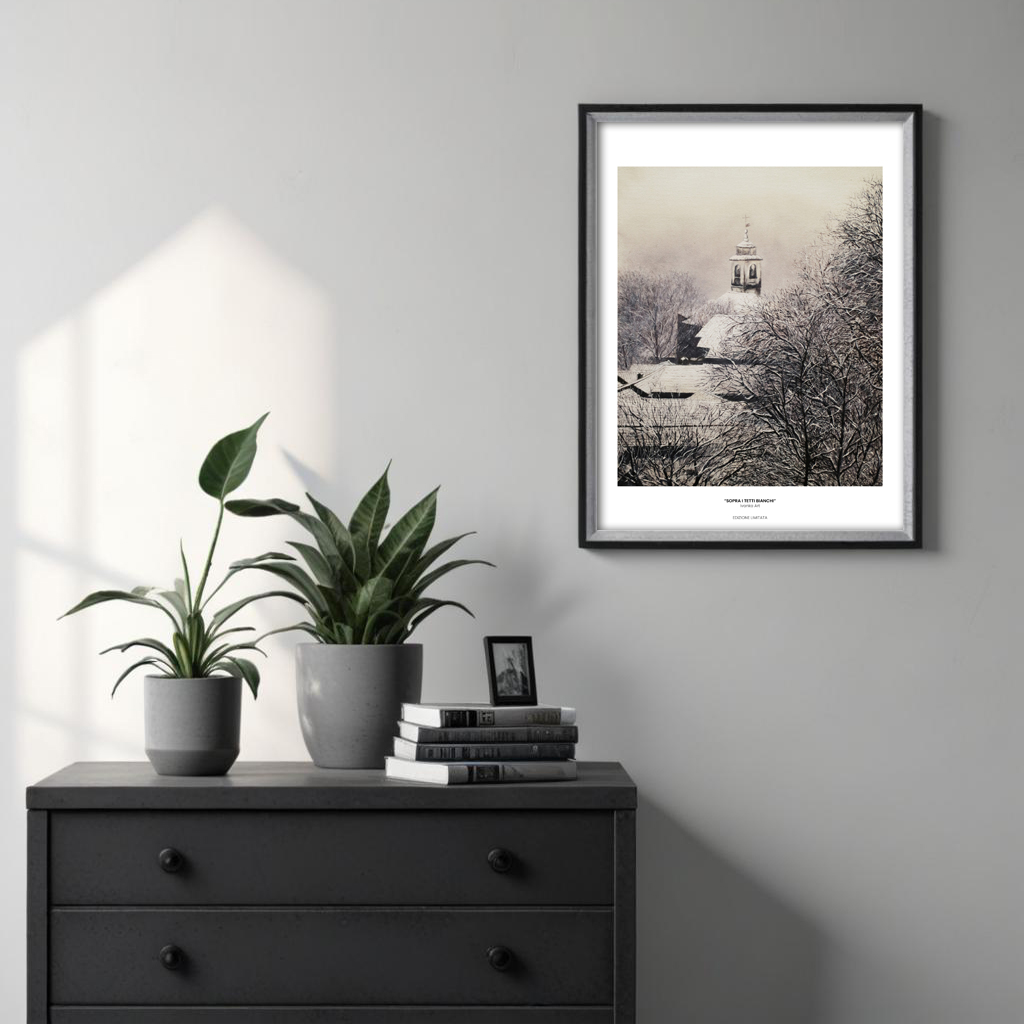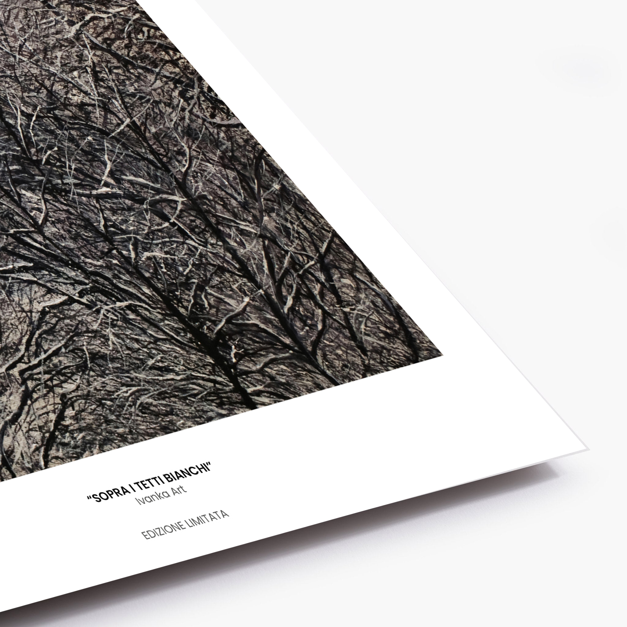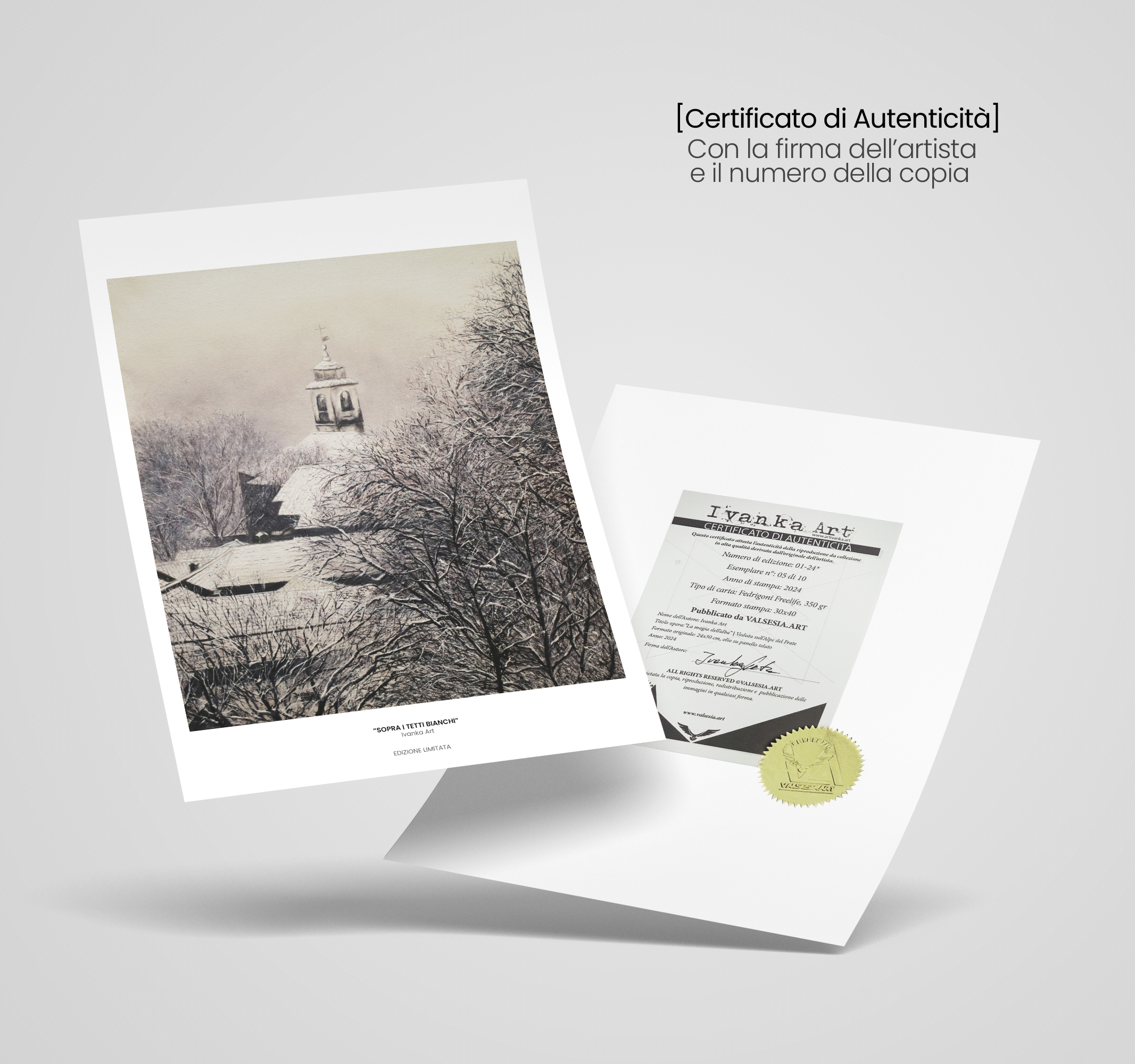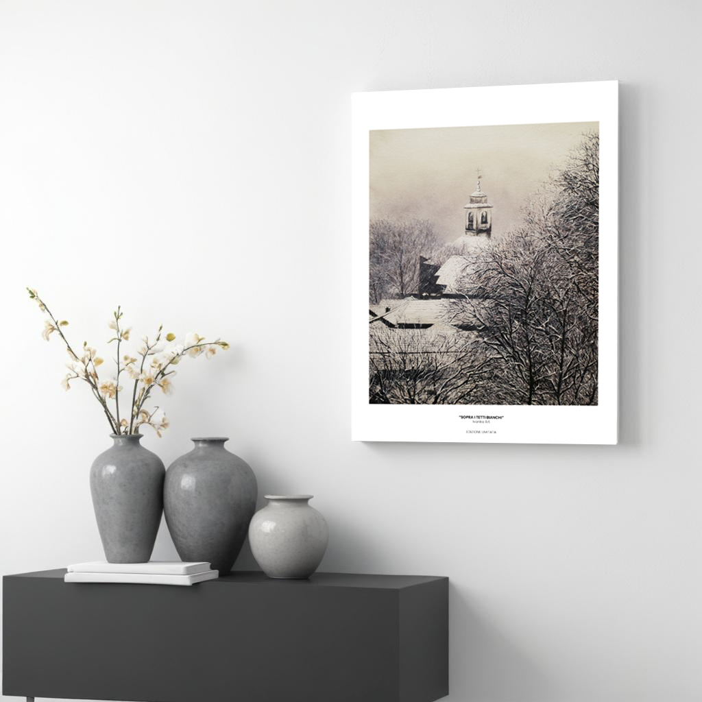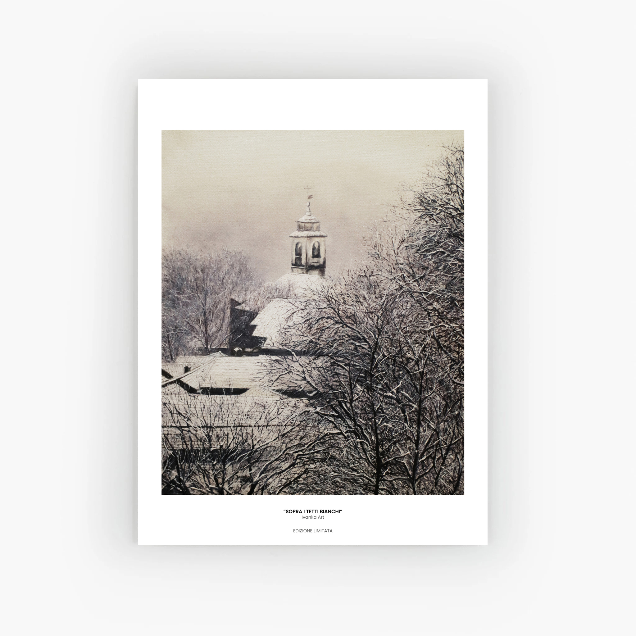 Questa stampa d’autore nasce da quell’attimo preciso: lo sguardo che si posa sui tetti imbiancati di una piccola frazione alpina, osservati dall’alto, mentre il campanile emerge in lontananza come punto fermo, discreto e rassicurante.