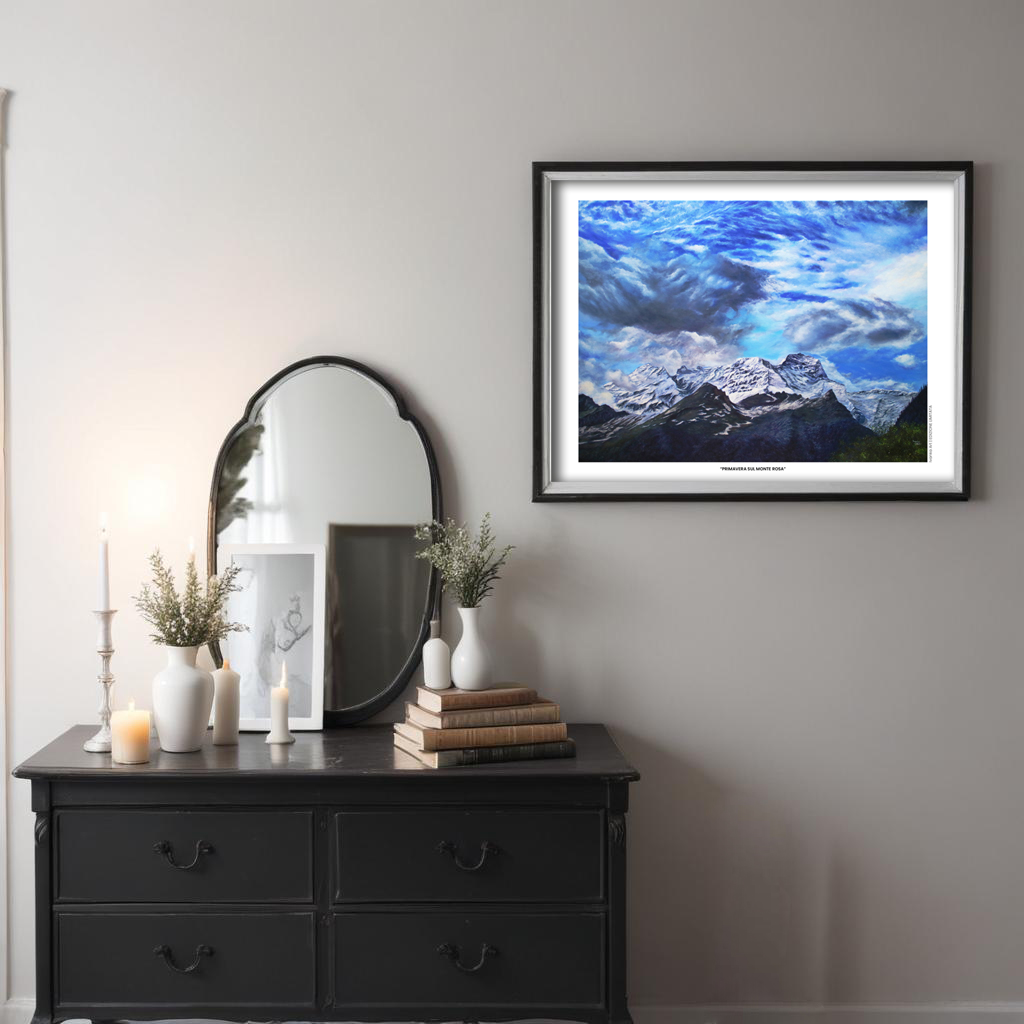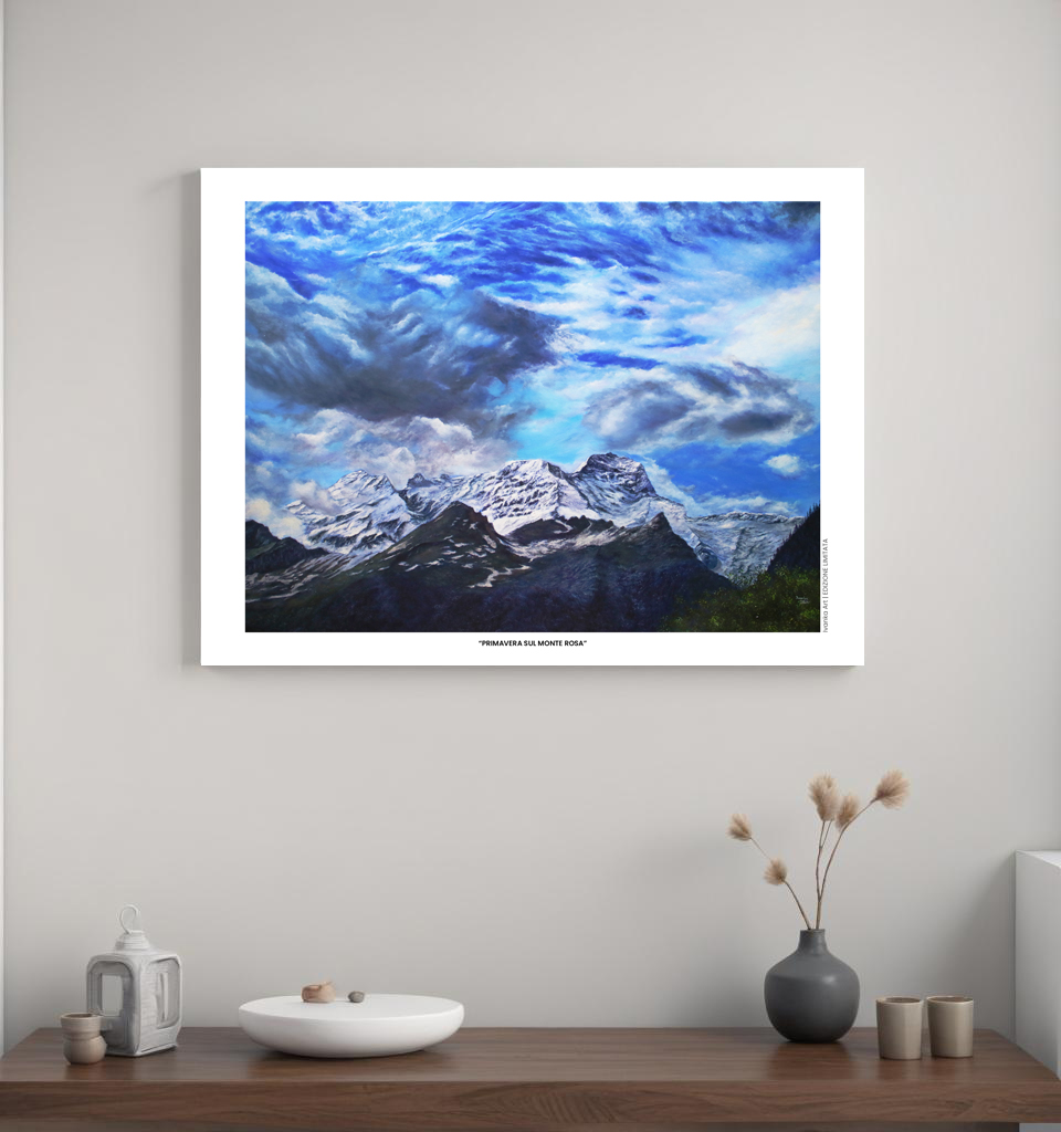 Stampata in tiratura limitata, questa opera è pensata per chi desidera portare con sé un’immagine simbolica e potente del Monte Rosa, non come semplice panorama, ma come presenza viva, capace di dare respiro e profondità agli spazi quotidiani.