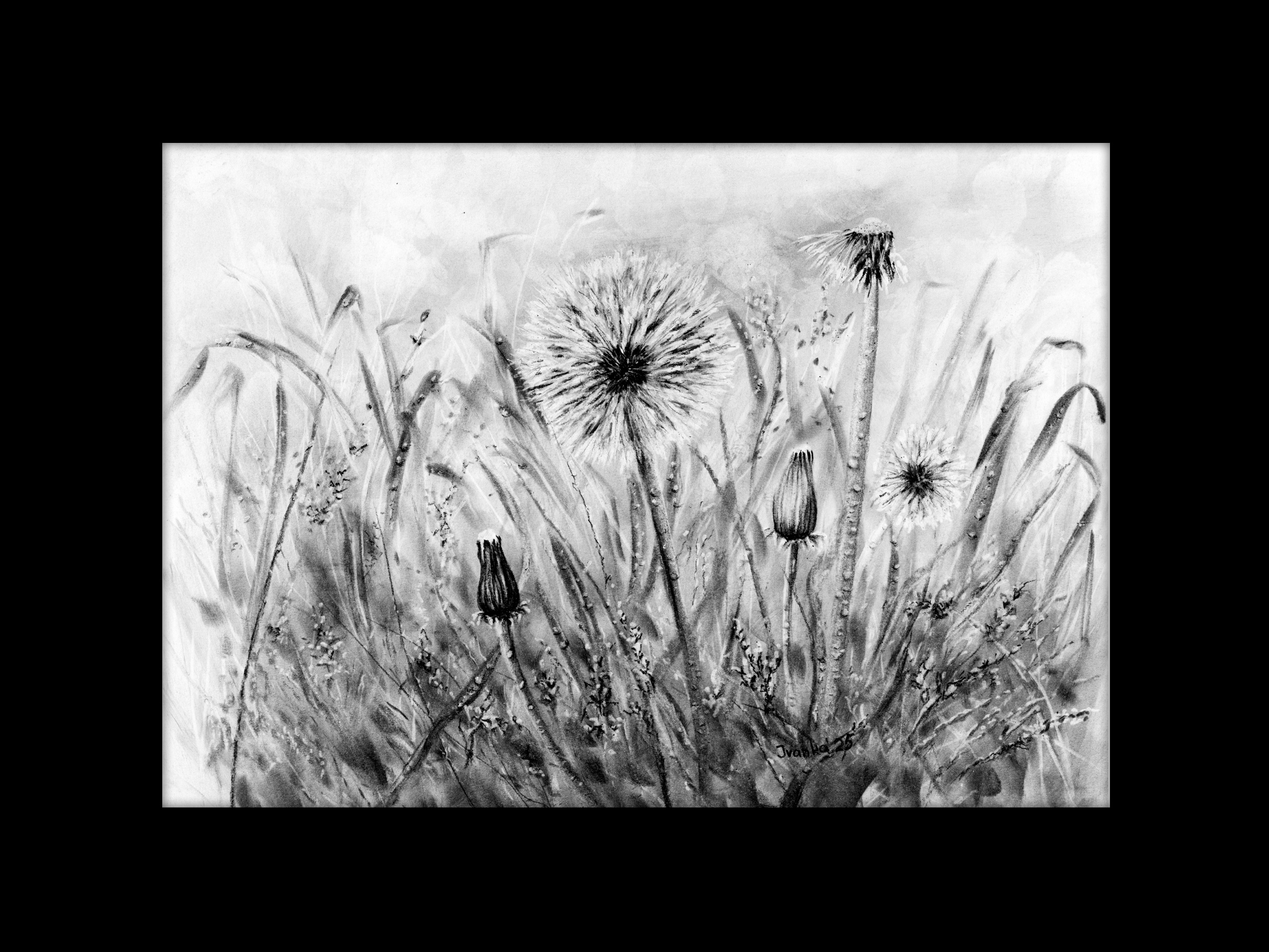 Il carboncino traccia con delicatezza i ciuffi che si sollevano, suggerendo il respiro del desiderio e la forza invisibile della natura. Ogni tratto rivela l’eleganza effimera di quei semi che volano via, simbolo di nuove partenze e di possibilità infinite.