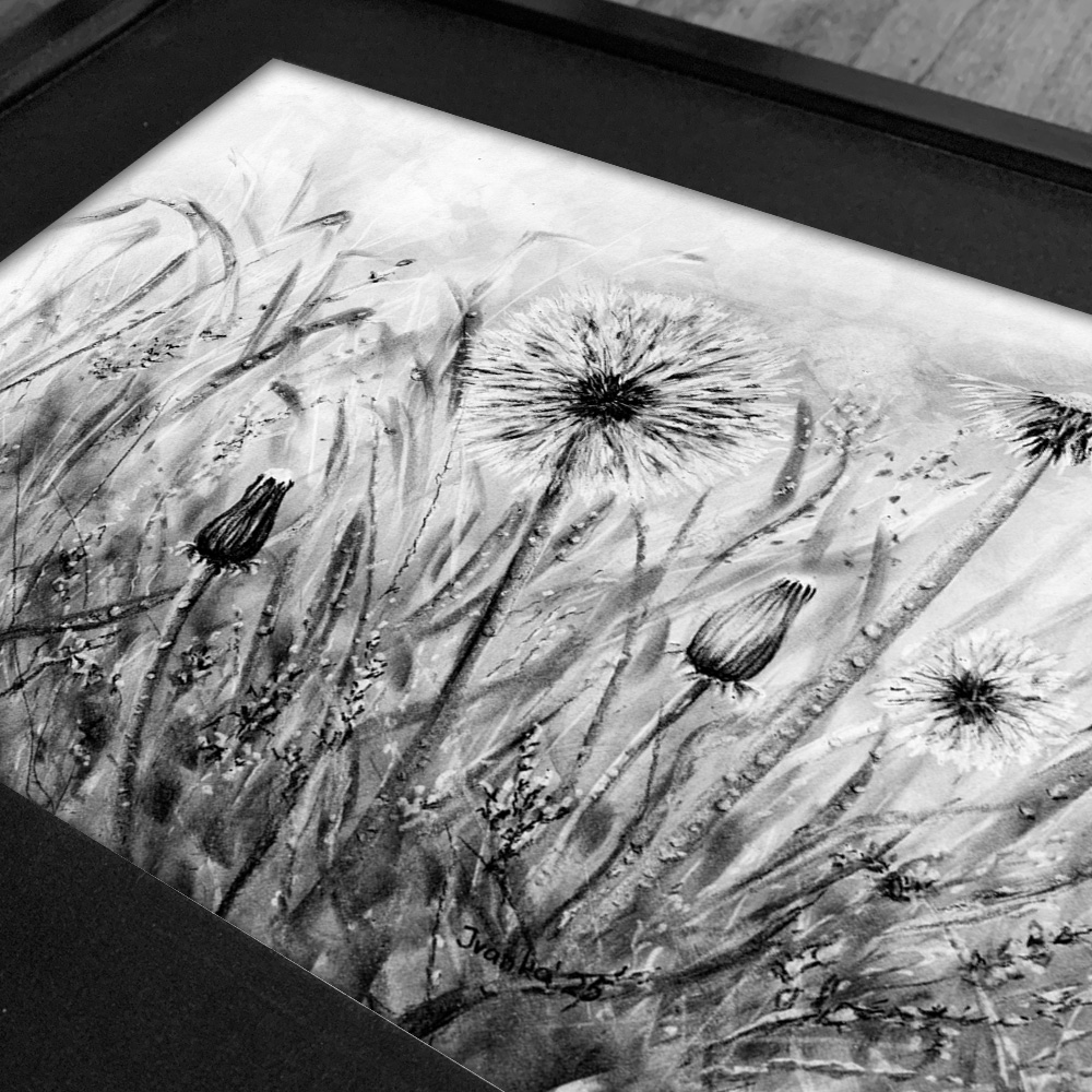 Un soffio leggero, un sogno che viaggia sul vento. Questo disegno originale a carboncino, parte della collezione “Sorrisi di Primavera”, celebra la magia silenziosa del tarassaco nel suo momento di trasformazione, quando ogni petalo diventa soffione e l’aria si riempie di promesse.