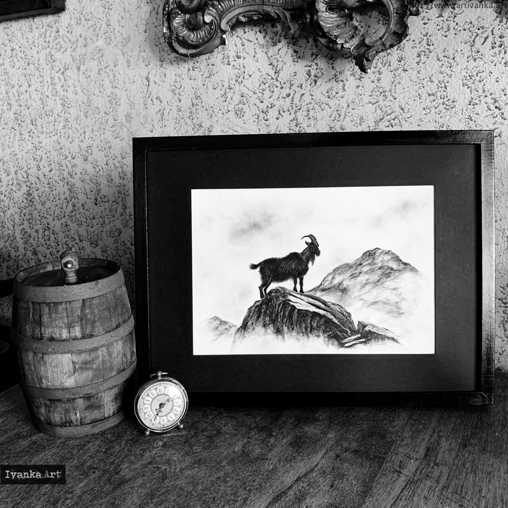 Attraverso le sfumature del carboncino, l’artista cattura la potenza silenziosa dell’animale: le corna si stagliano fiere verso il cielo, il corpo saldo sulla roccia sembra fondersi con la terra stessa. Ogni tratto restituisce la sensazione dell’altitudine, dell’aria sottile e del rispetto che suscita la natura incontaminata.