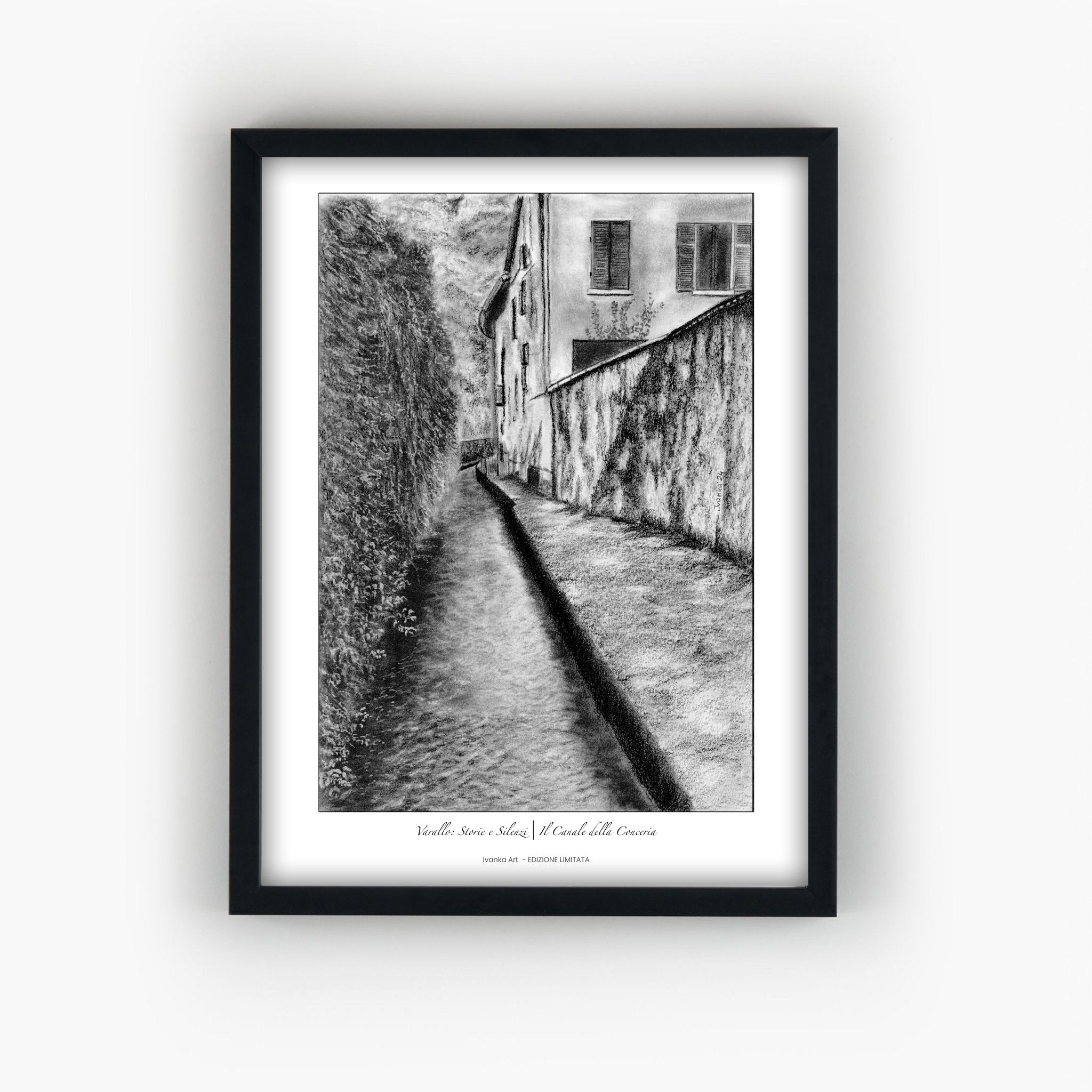 Le sfumature del carboncino restituiscono la delicatezza e la quiete di questo luogo dimenticato, dove ogni dettaglio parla di storia e autenticità . Questa stampa d’arte celebra la bellezza nascosta di Varallo, un invito a scoprire ciò che rimane, e continua a vivere, dietro ogni angolo.