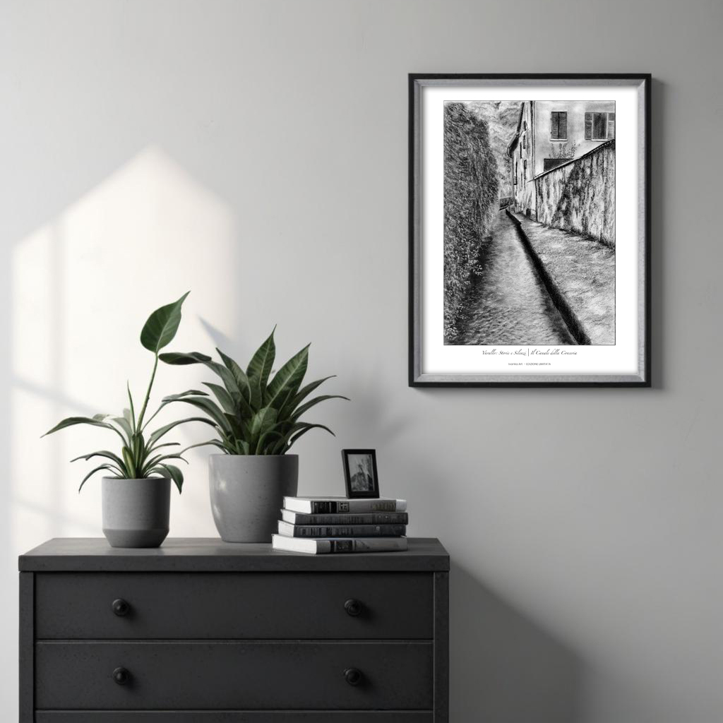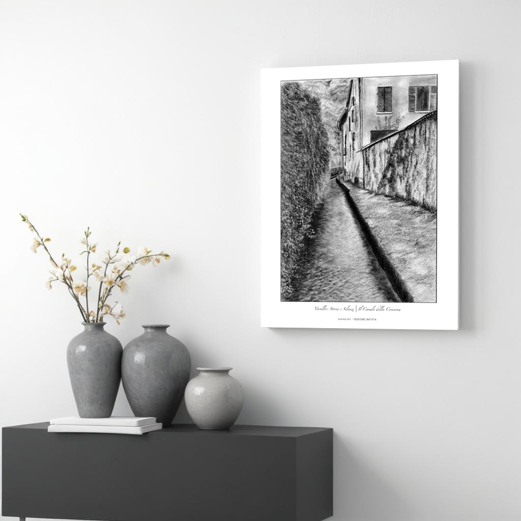 Un disegno a carboncino che racconta la poesia di un angolo nascosto di Varallo, dove il tempo sembra essersi fermato. Il canale, ultimo segno di un’antica conceria ormai scomparsa, scorre silenzioso tra le pietre, custodendo la memoria di un passato lontano.