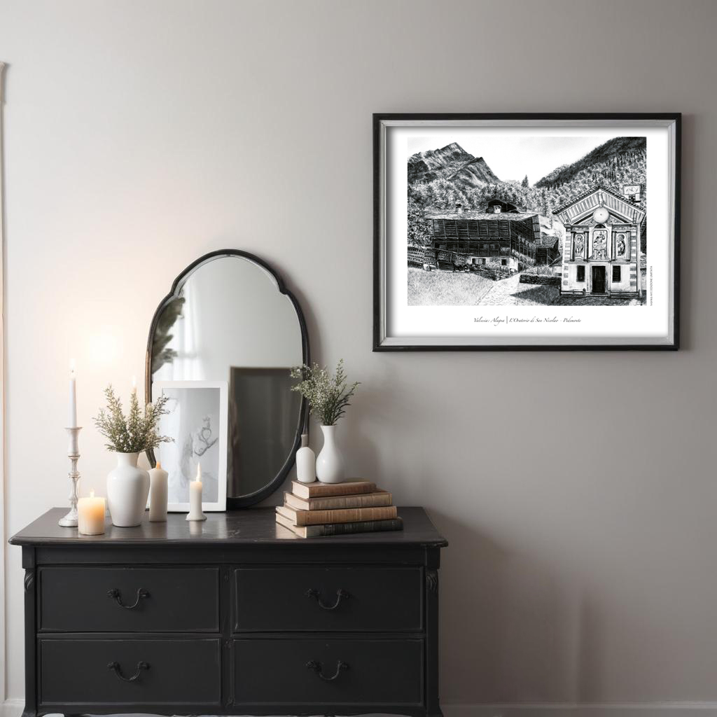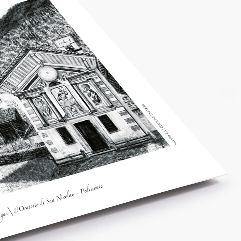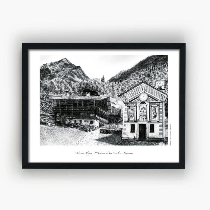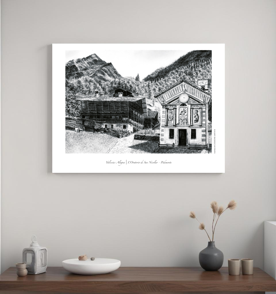 Nel cuore di Pedemonte, tra antiche case walser e il profilo delle montagne, si erge l’Oratorio di San Nicolao, custode di silenzio e devozione. Questa opera a carboncino trasforma la luce chiara della montagna in emozione pura, unendo spiritualità e paesaggio in un equilibrio armonioso.