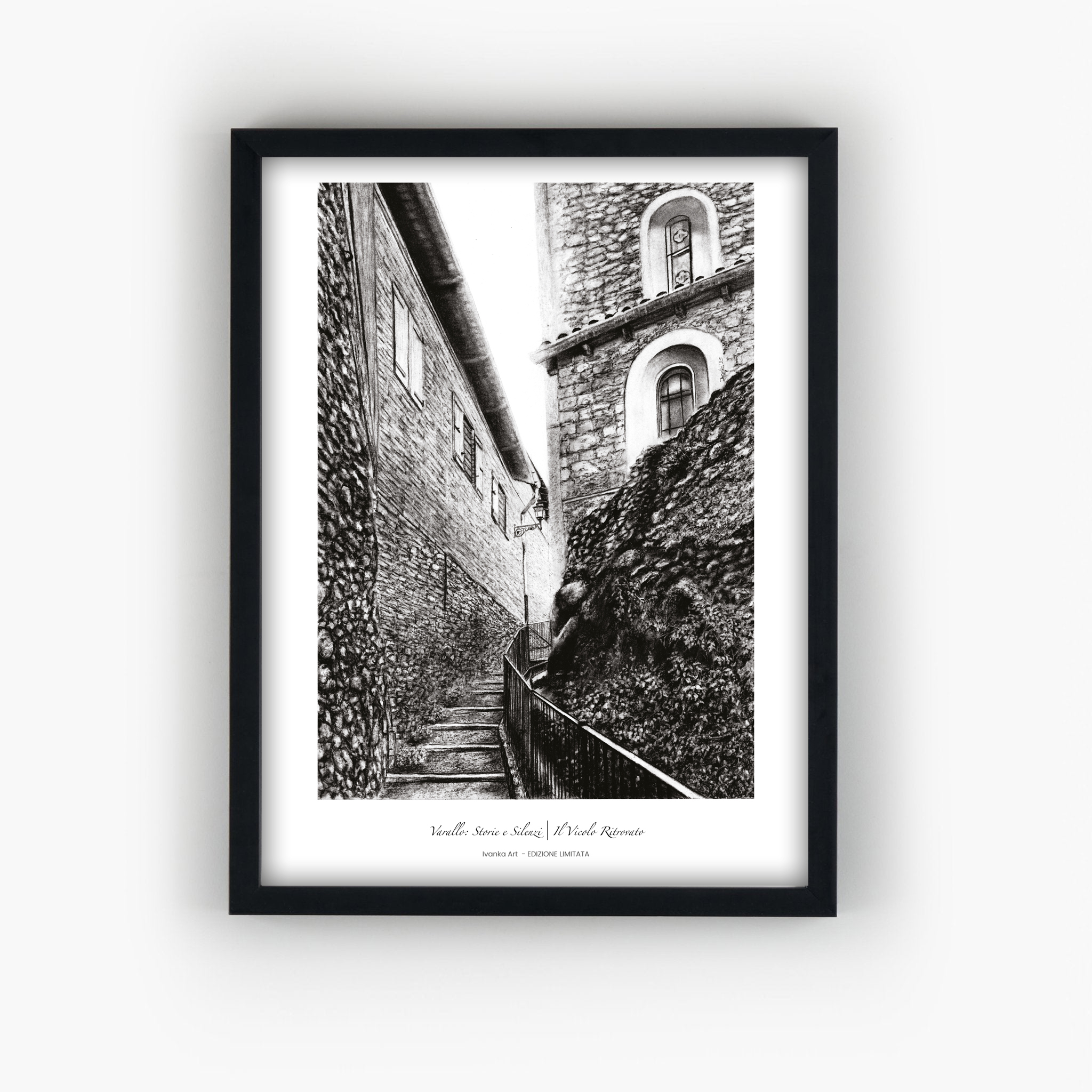 Questo disegno a carboncino ritrae uno degli angoli più nascosti di Varallo, un vicolo silenzioso che si cela dietro la Chiesa di Sant’Antonio da Padova e conduce, con il suo percorso discreto, verso il fiume Sesia.