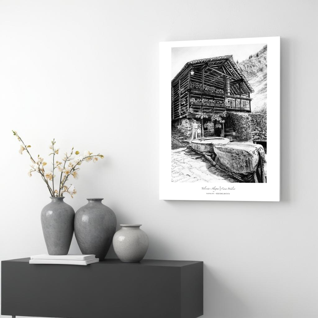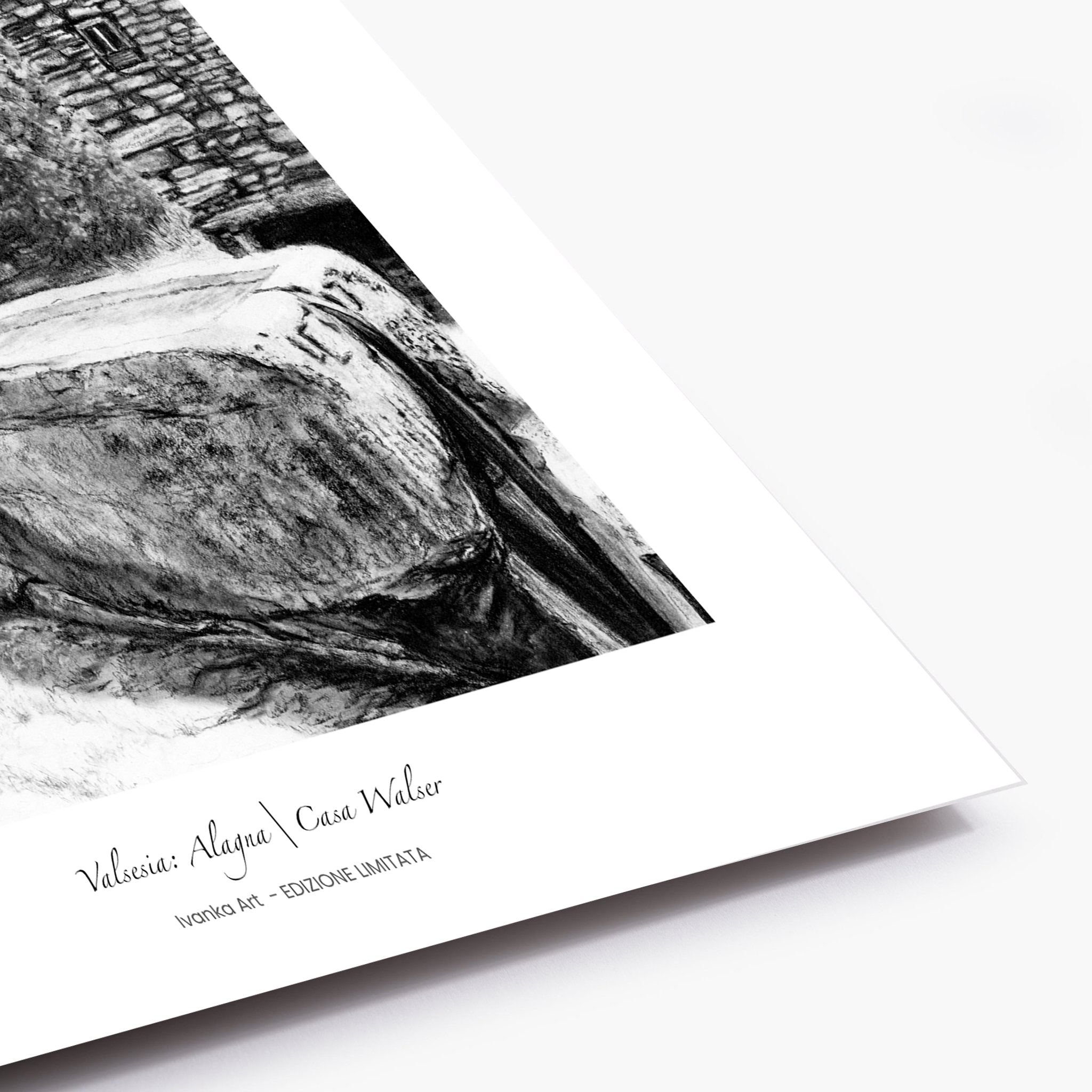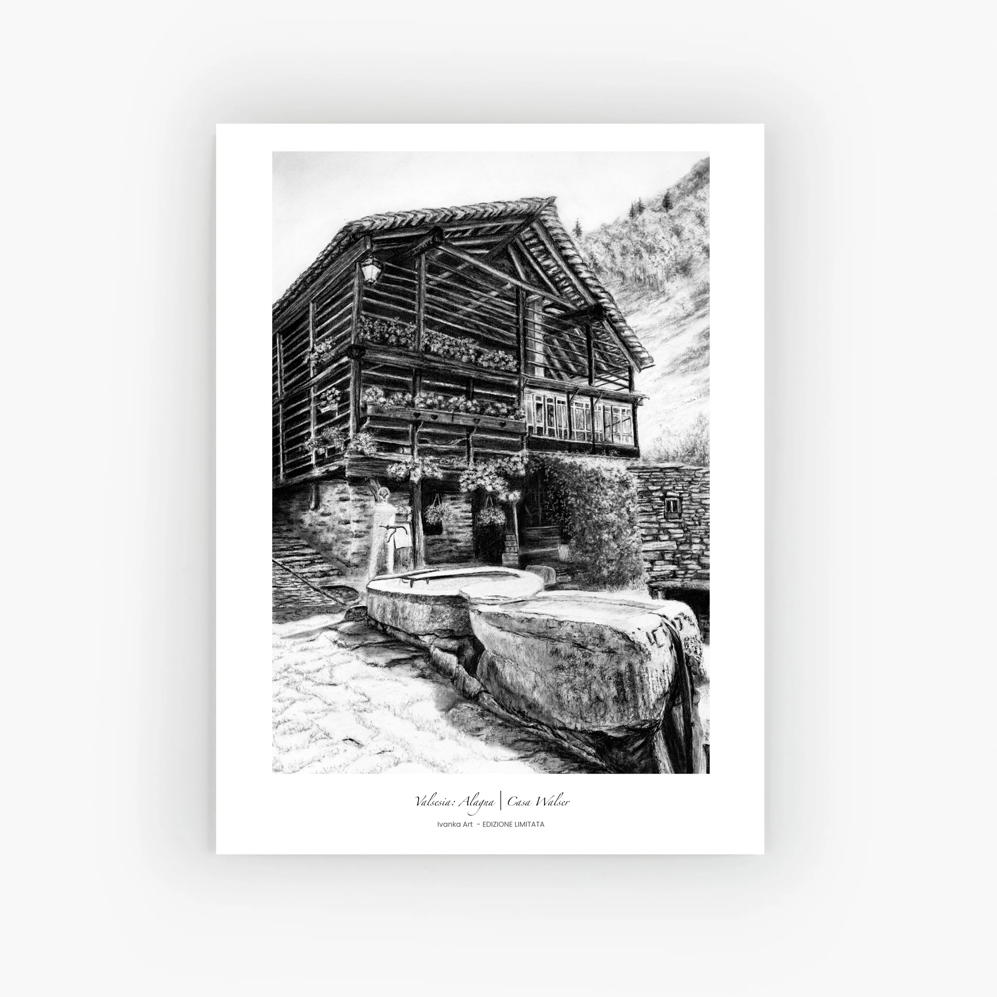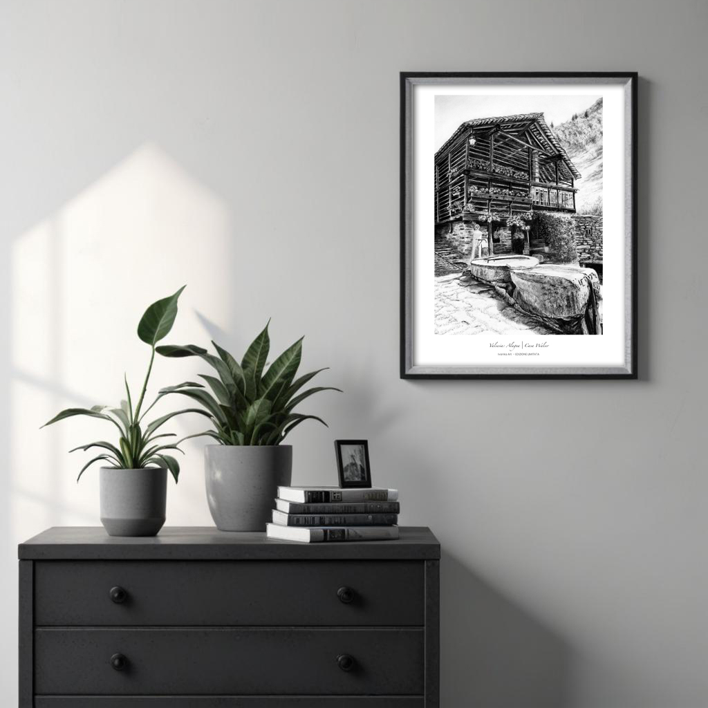 Tra le montagne della Valsesia, dove il tempo sembra rallentare, “Casa Walser” racconta la storia silenziosa di chi ha saputo costruire con le mani e con l’anima. In questo disegno a carboncino, la luce del sole accarezza il legno antico e la pietra, rivelando la bellezza autentica di un’architettura che è insieme rifugio, memoria e poesia alpina.
